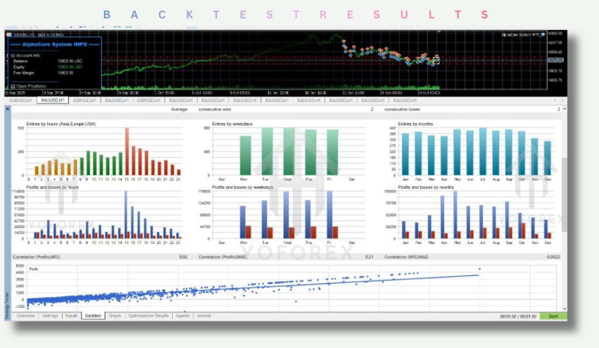 AlphaCore System EA V2.0 is optimized to run on the H1 timeframe. This timeframe strikes a balance between noise reduction and trade frequency, making it suitable for traders who prefer steady setups rather than high-frequency scalping.