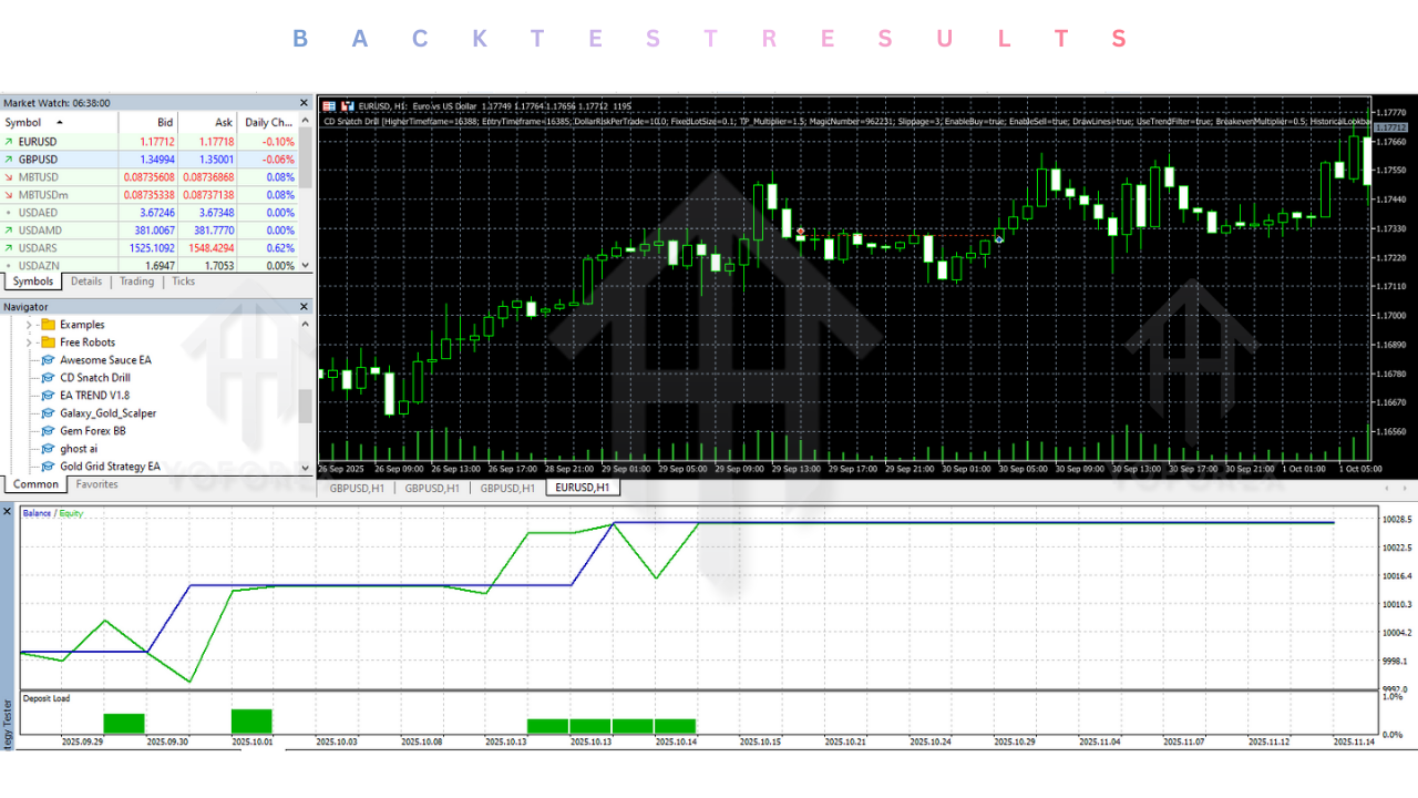 Backtesting plays a crucial role in understanding how an EA behaves under historical conditions. CD Snatch Drill EA V38.02 MT5 has been tested across various market phases to evaluate stability, drawdown behavior, and trade consistency.