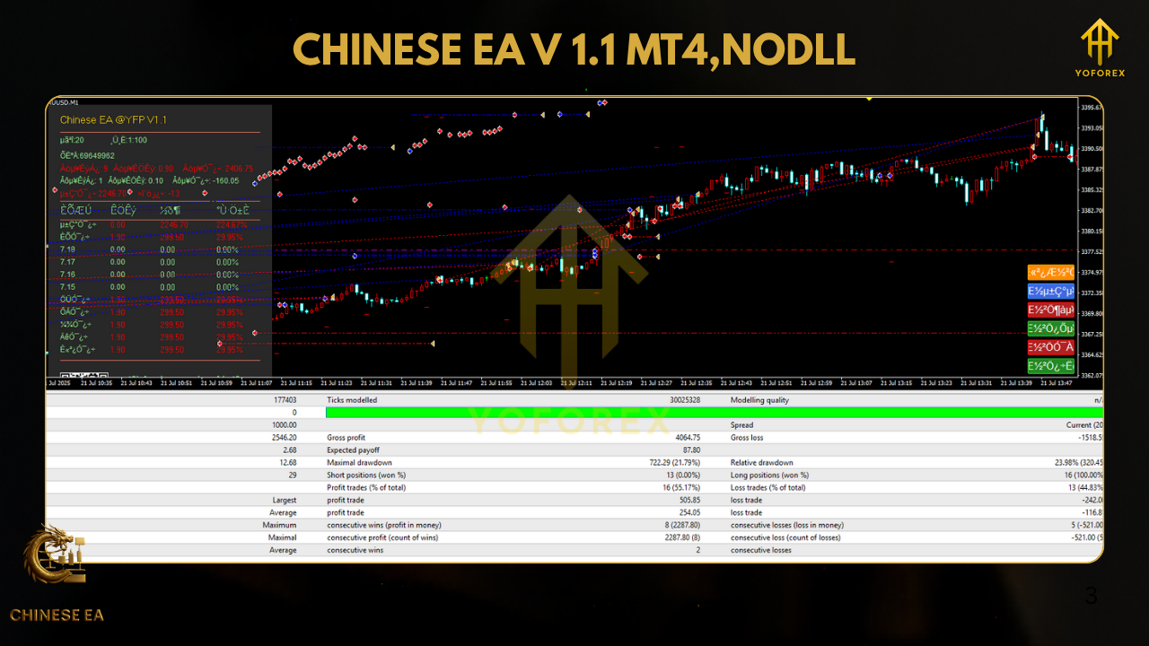 These results demonstrate that Chinese EA V1.1 performs well under normal market conditions and provides solid returns without excessive risk. Keep in mind that market conditions can impact performance, and you should adjust your settings accordingly.