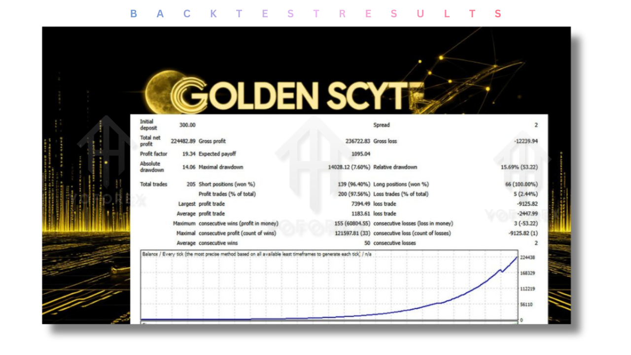 Golden Scythe EA has demonstrated solid backtest results, particularly in XAUUSD trading. Historical data shows a low drawdown and steady growth, with consistent monthly profits. The backtesting results suggest that the EA performs well under different market conditions, including both trending and volatile periods.