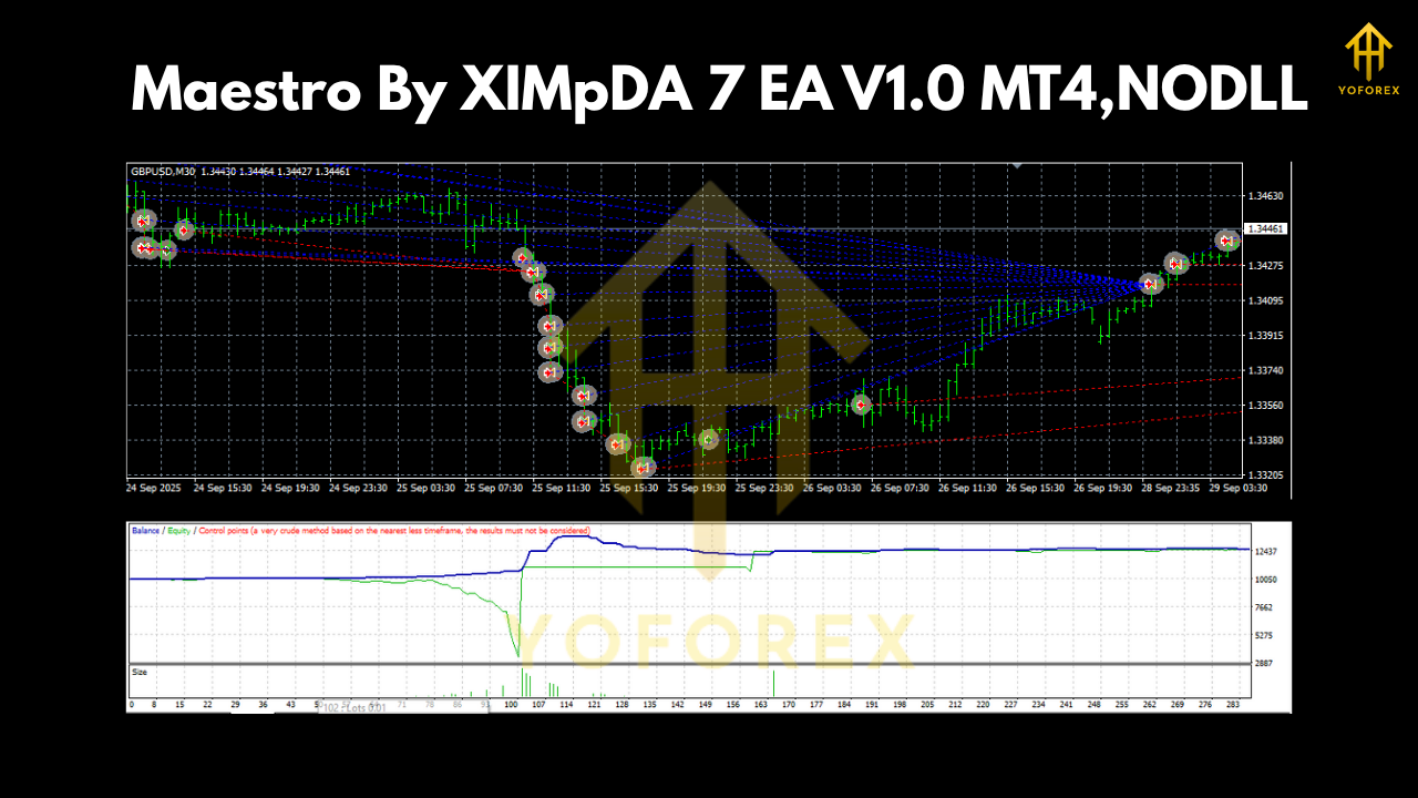 Maestro By XIMpDA 7 EA V1.0 MT4 is not your average trading robot. It’s a fully automated Expert Advisor developed to handle trades intelligently across multiple pairs — particularly GBPUSD, EURUSD, and USDJPY. Built to perform on any timeframe, it’s crafted for flexibility so traders can adapt it to their style, whether scalping or swing trading.