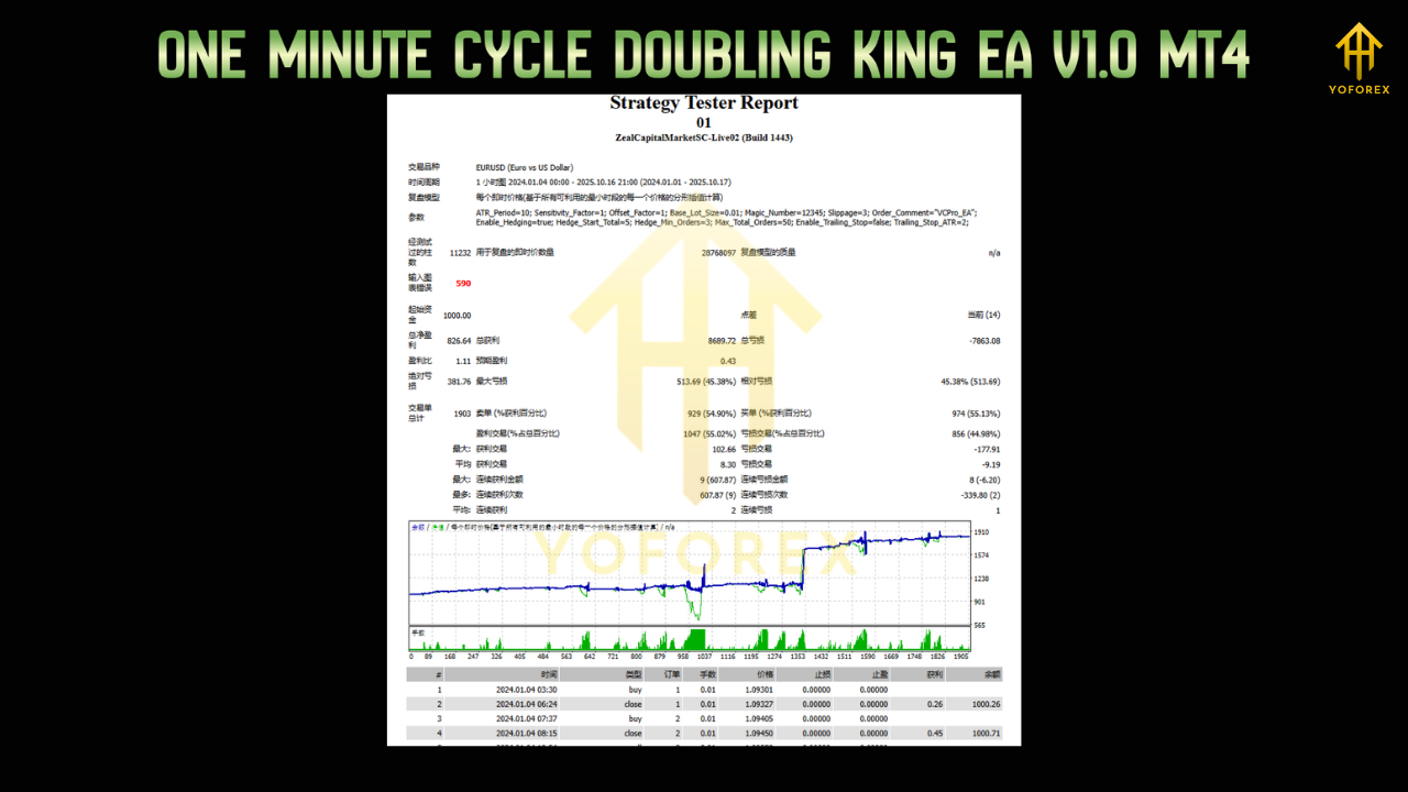 While optimized for EURUSD, GBPUSD, and other major pairs, the One Minute Cycle Doubling King EA V1.0 MT4 can be applied to a variety of currency pairs, allowing traders to diversify their portfolio.