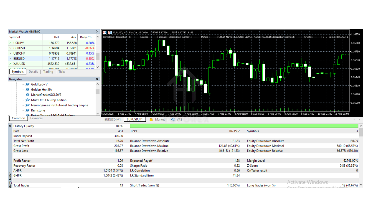 The Remstone EA V2.49 has been tested on multiple trading accounts with a consistent track record of profitability. While past performance is not always indicative of future results, the EA’s backtest data and real-time execution provide confidence in its reliability.