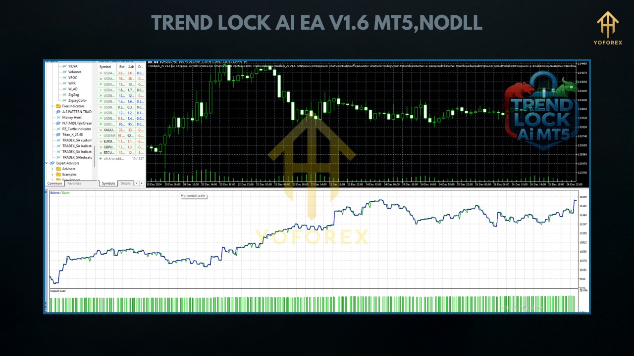 The TREND LOCK AI EA is an advanced MetaTrader 5 Expert Advisor that uses AI-enhanced algorithms to identify strong market trends and execute trades in the direction of momentum. Its built-in trend filter, volatility scanner, and dynamic stop-loss system help reduce false signals while maximizing profit potential.