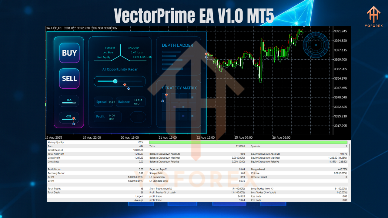 The VectorPrime EA is a MetaTrader 5 expert advisor optimized for single-instrument momentum trading on the H1 timeframe. Unlike many robots that depend on news feeds or multi-symbol logic, VectorPrime works independently with a modular, scenario-driven approach.