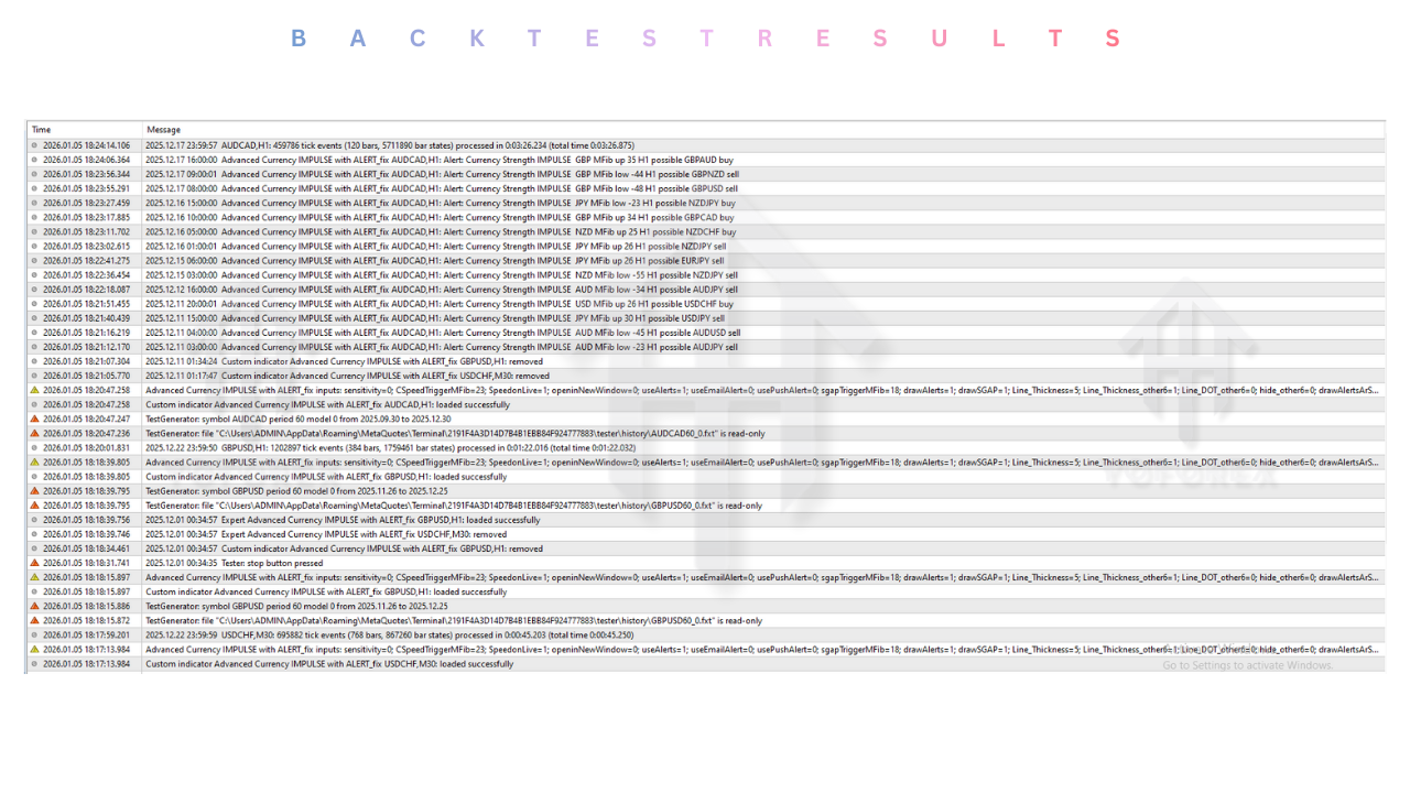 4. Non-Repainting Signal Logic Integrity is the most important feature of any technical tool. The Advanced Currency IMPULSE Indicator V8.1 is strictly non-repainting. Once a candle closes and a value is plotted, it is etched in stone. This is critical for backtesting and strategy development. You can trust that the historical data you see on the chart is exactly what you would have seen in live trading, allowing for accurate visual verification of the strategy.