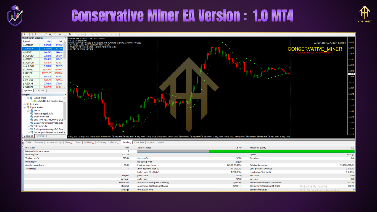 This EA was designed to capture small, consistent profits—think 1–2% daily—without the heart-stopping drawdowns. It’s been backtested on M1 charts since 2010, proving its edge in live markets too. So if you’re done with overpriced subscriptions and risky strategies, Conservative Miner EA might just be your new go-to scalper.
