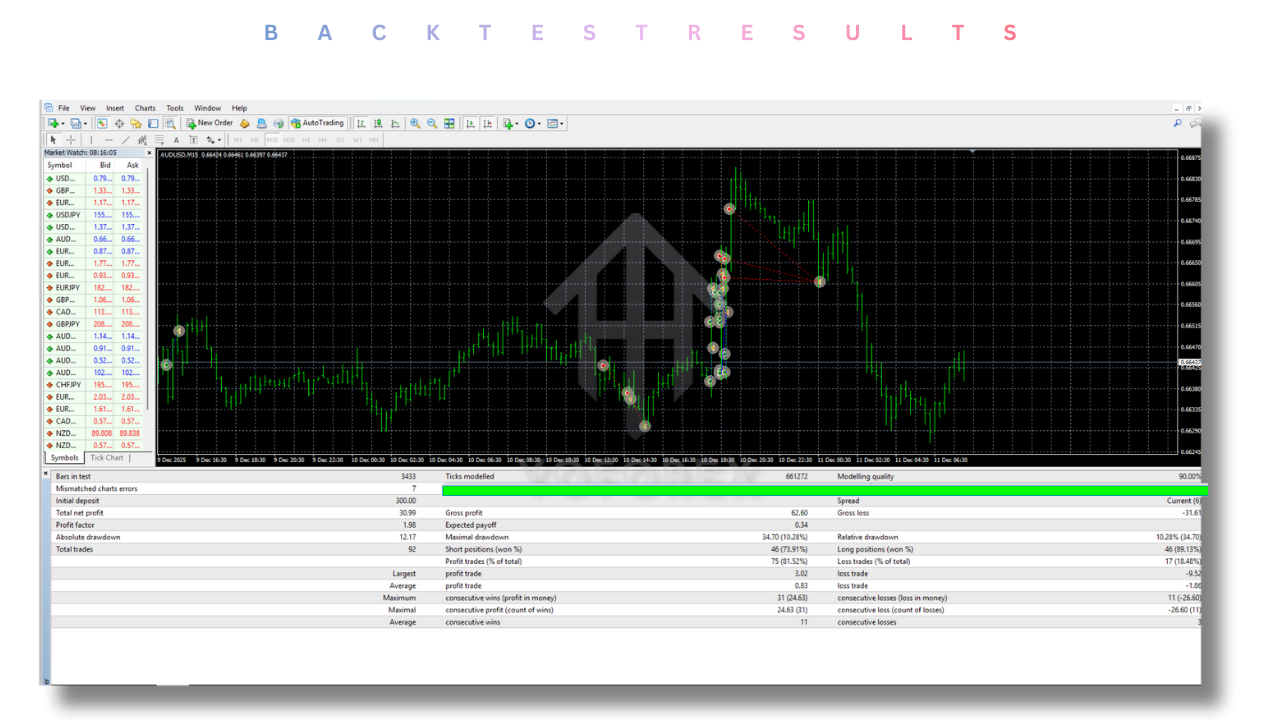 For EURUSD, the EA prefers cleaner trends and liquidity-driven movements, often active during London and New York sessions. For AUDUSD, it adapts to commodity-linked volatility and Asia-Pacific session behavior, avoiding unnecessary trades during erratic market phases.