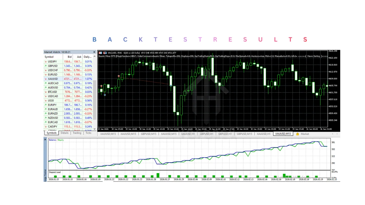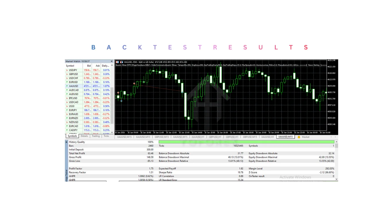 Performance, that elusive phantom haunting every EA review, takes center stage when scrutinizing Beatrix Miner MT5, where backtested glory meets the gritty reality of live trading. Developers tout a win rate hovering around 72% across 15 major and minor pairs, derived from rigorous simulations using tick data from 2018 onward—a statistic that, if true, would make even the most jaded intermediate trader perk up. In practical terms, during the 2022 USD strength surge, the EA navigated choppy waters by entering long positions on confirmed uptrends, reportedly netting 15-20% monthly returns on conservative settings, though past performance whispers rather than shouts future gains.