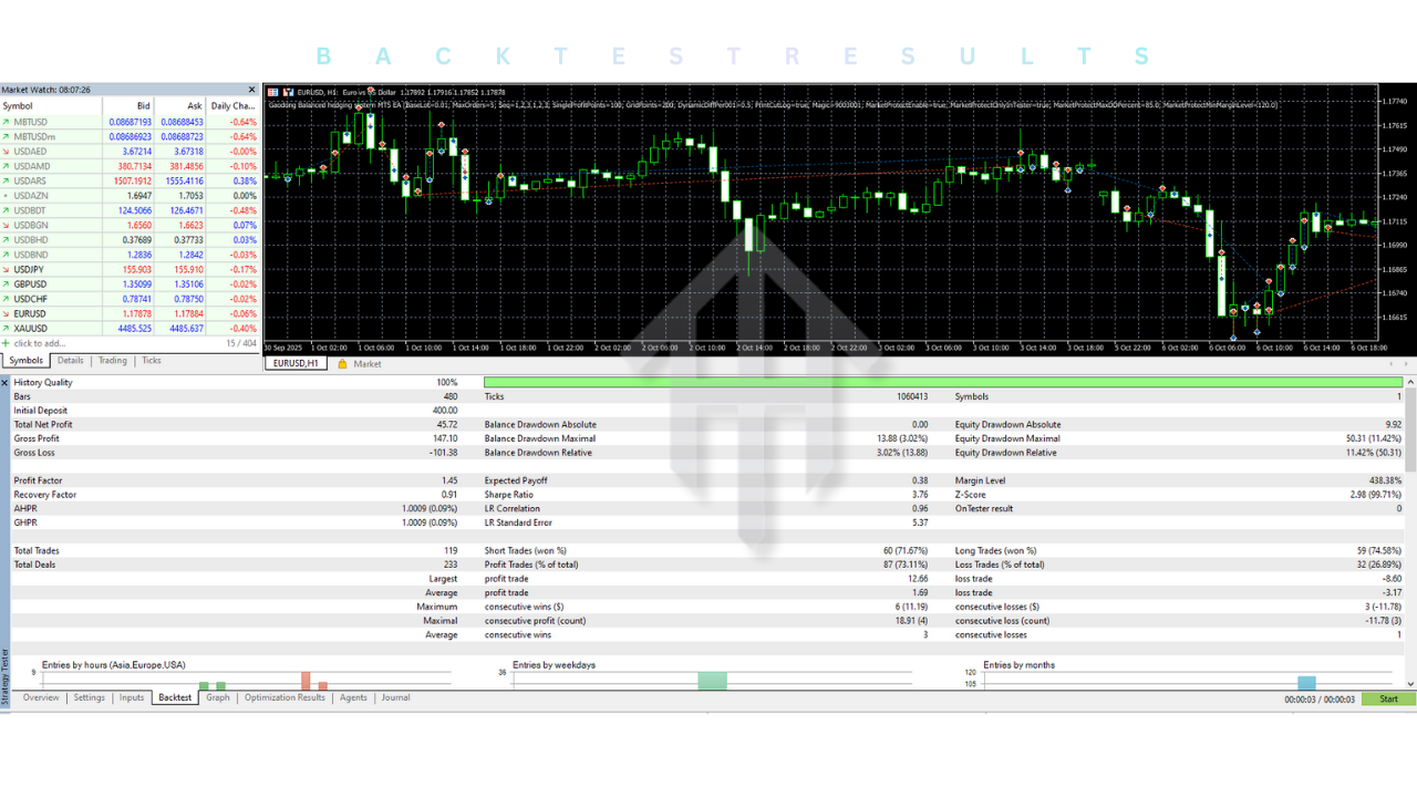 As with any hedging or arbitrage system, the strategy is sensitive to broker conditions. High spreads or slippage can erode the small distinct profits that the system aims to capture. While the risk is "dynamic," hedging strategies can still face challenges during extreme, sustain one-way market crashes where the counter-trend positions act as a drag on equity. It requires the terminal to be online 24/5 or the use of a VPS (Virtual Private Server) to manage positions continuously, adding a small monthly cost for the user.