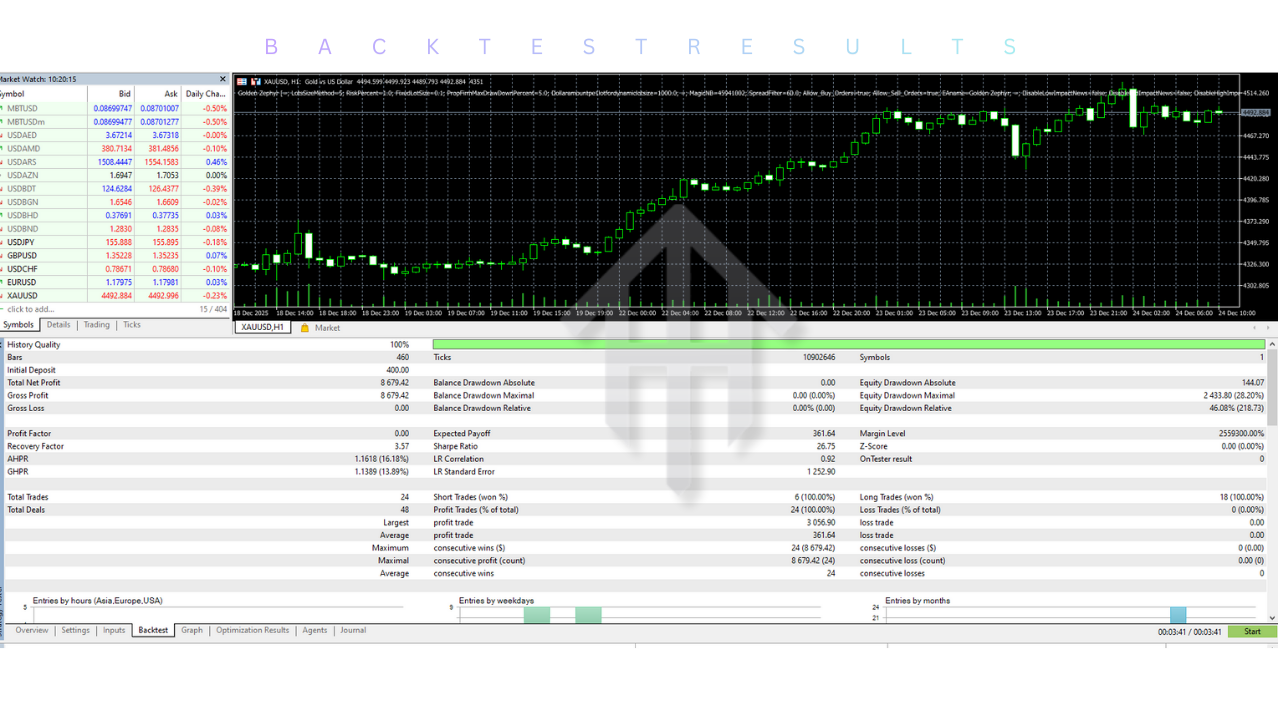 Backtesting Golden Zephyr V1.30 on MetaTrader 5 demonstrates a strategy focused on stability rather than reckless gain. In simulations covering the volatile periods of 2023-2025, the EA shows a high win rate with a controlled equity curve. The "Quantum Trend Dynamics" logic effectively filters out false breakouts, resulting in a lower drawdown compared to standard breakout bots. Crucially, the backtests highlight the importance of the News Filter; performance significantly improves when news trading is avoided. The "Prop Firm" mode in backtesting confirms that the EA can adhere to strict daily loss limits, making it a viable tool for passing funding challenges. As always, users should run their own backtests using 99.9% tick data with real variable spreads to verify results for their specific broker.