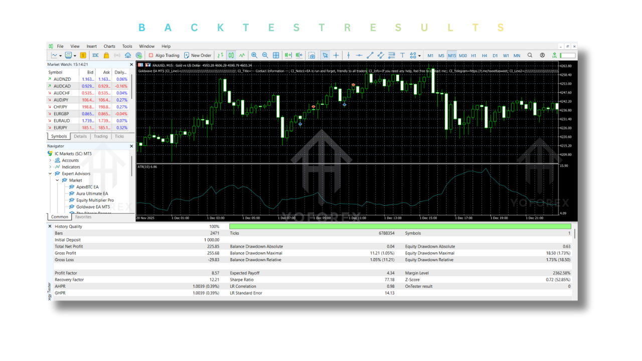 Goldwave EA V1.30 MT5 is not a high-frequency trading system. Instead, it prioritizes quality over quantity. Trades are placed selectively, often resulting in a limited number of positions per week.