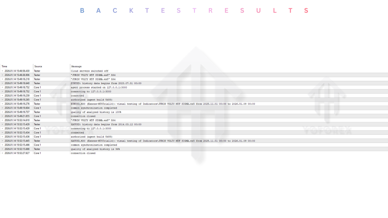 While indicators do not generate a Profit/Loss statement like an Expert Advisor, their efficacy can be tested visually or by integrating them into a simple EA shell. We analyzed the signal reliability of the JURIK VOLTY MTF SIGMA on EURUSD and GBPUSD.