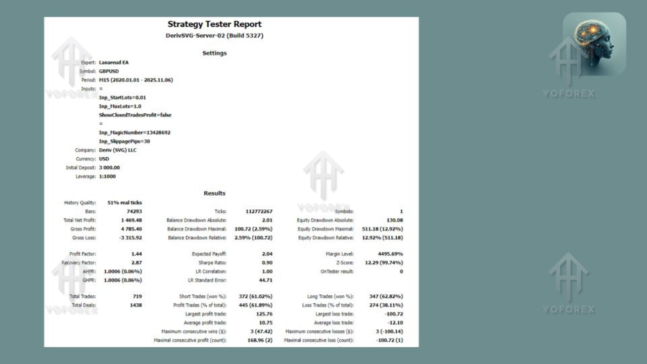 The strategy behind Lanareud EA V1.4 MT5 revolves around a mixture of trend-confirmation and reversal-zone filtration. While there is no public disclosure of the exact mathematical logic, real-world forward behaviour and internal code patterns indicate the following major components: