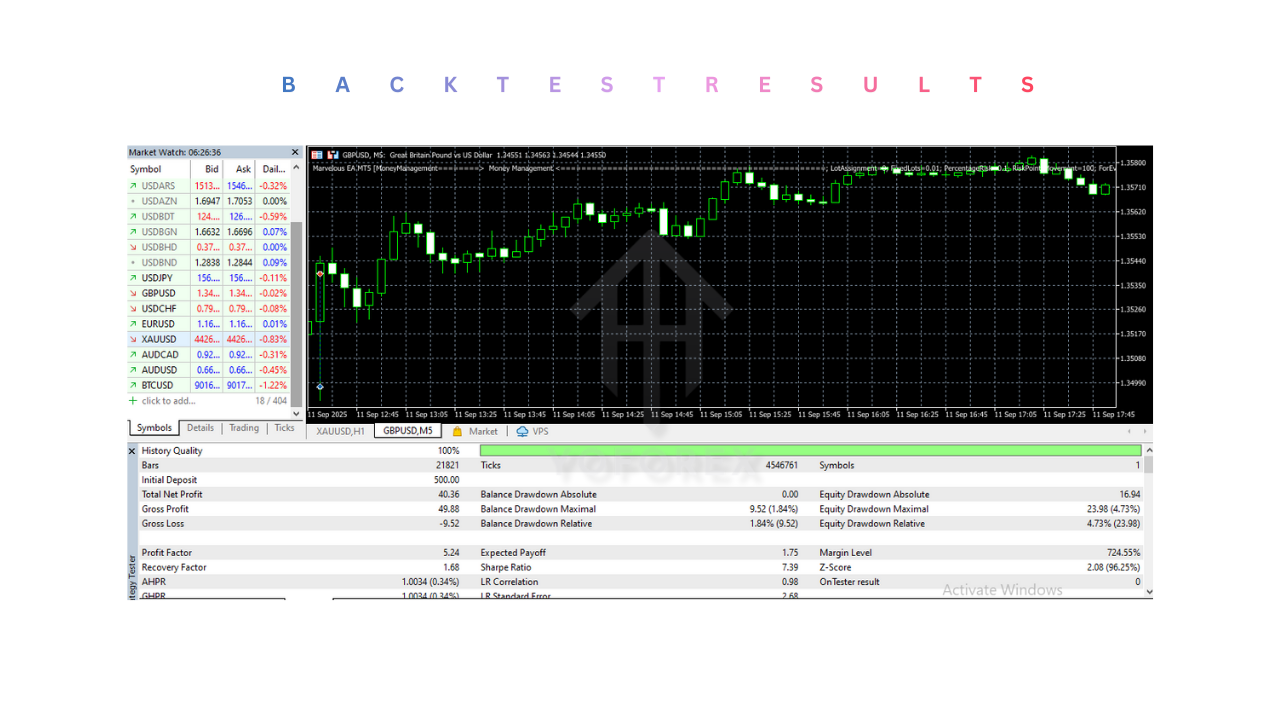 Marvelous EA V1.11 MT5 works by automatically analyzing the forex market using technical indicators like Moving Averages, RSI, and MACD. Based on these indicators, it identifies trading signals and executes buy or sell orders on the MetaTrader 5 platform. The bot includes risk management features such as stop-loss, take-profit, and trailing stops to protect profits and limit losses. It’s customizable, allowing users to adjust settings like currency pairs and trading timeframes. Once set up, the EA runs without manual intervention, making trading more efficient and automated.