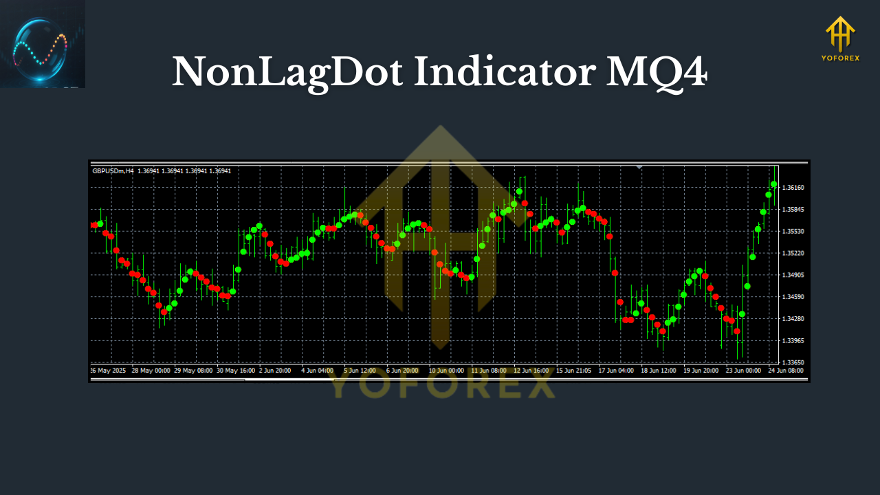 The NonLagDot Indicator is a custom MT4 indicator coded in MQ4 that focuses on reducing lag compared to traditional moving averages. Rather than waiting for a full bar confirmation, it calculates smoothed price action and prints colored dots directly on the chart.
