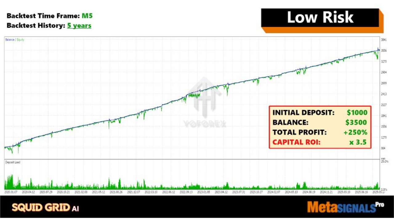 As of this writing, public backtest data for Squid Grid AI EA V1.0 MT4 is limited. Prospective users should request the developer’s own 12-month backtest reports, which—according to vendor claims—show: