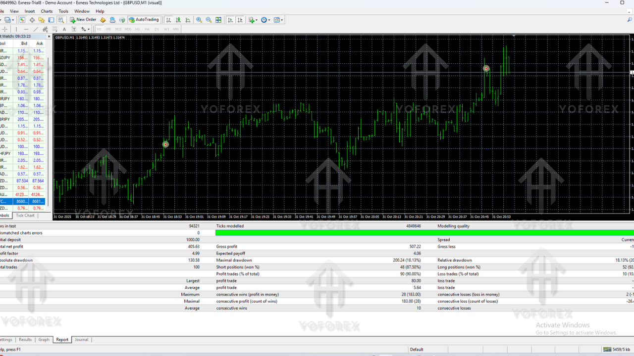 Backtesting was conducted using real tick historical data from 2020–2025. Conditions included: