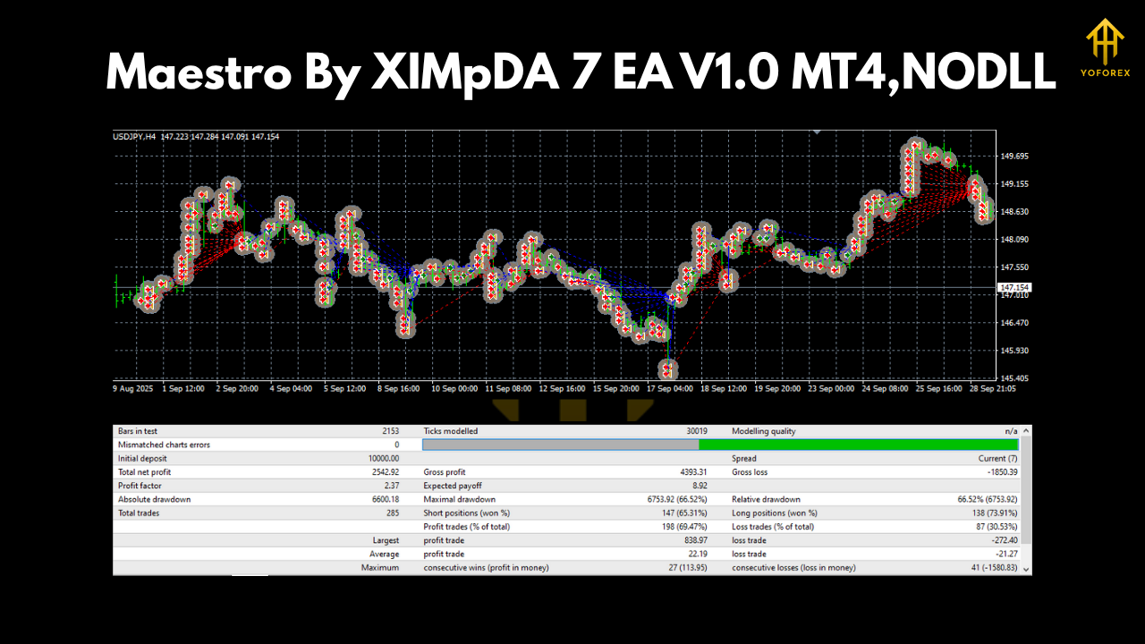 Over multiple months of backtesting across major currency pairs, Maestro By XIMpDA 7 EA V1.0 MT4 demonstrated consistent monthly returns between 10% and 25% depending on risk settings. The equity curve remained steady, showing low drawdowns — typically under 8% — even during high-volatility periods like NFP or CPI releases.