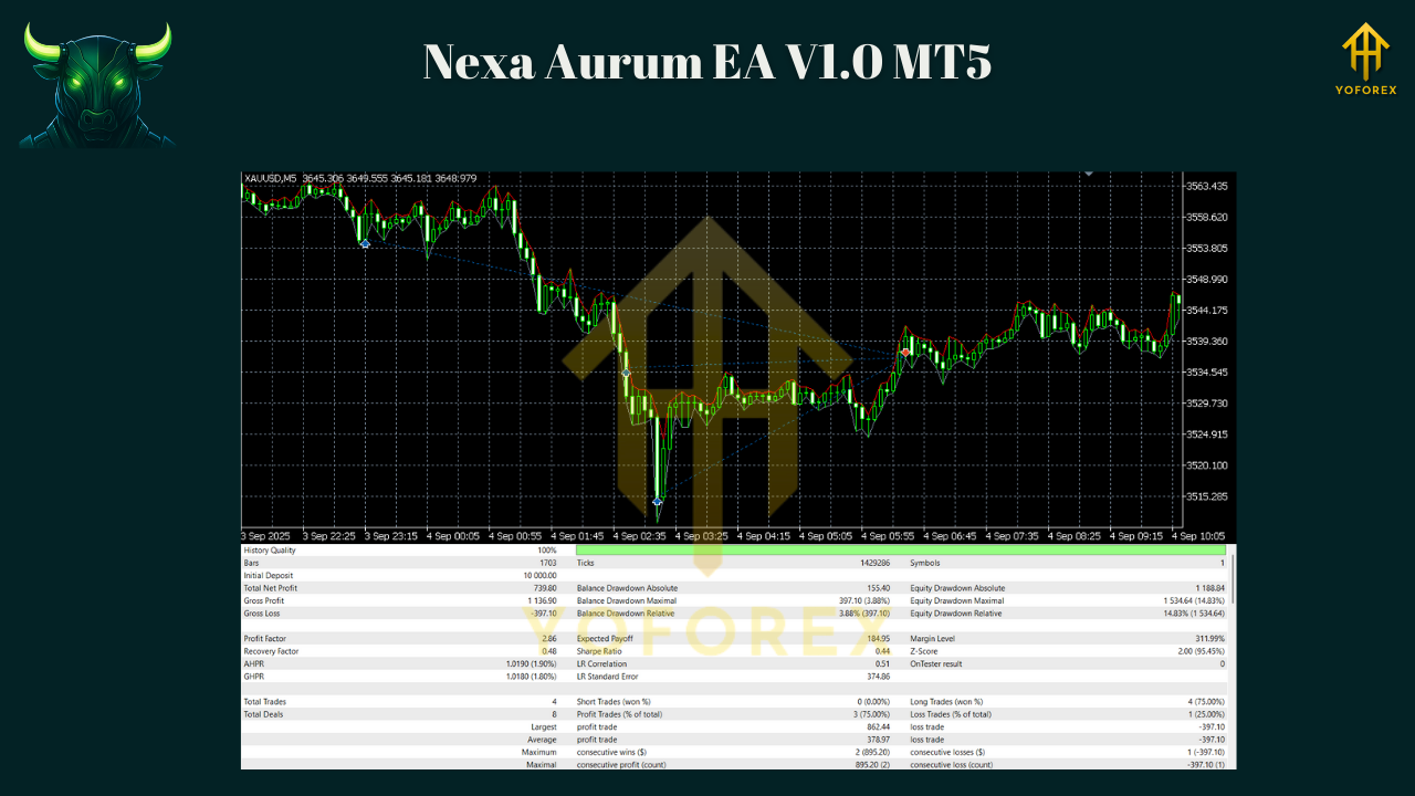 This EA isn’t just a basic grid bot. It’s loaded with tools like a historical news filter, Monday/Friday rules, trading session filters, and daily loss guards. Designed for ECN brokers with low spreads and run best on a low-latency VPS, Nexa Aurum brings professional-grade precision to gold trading.