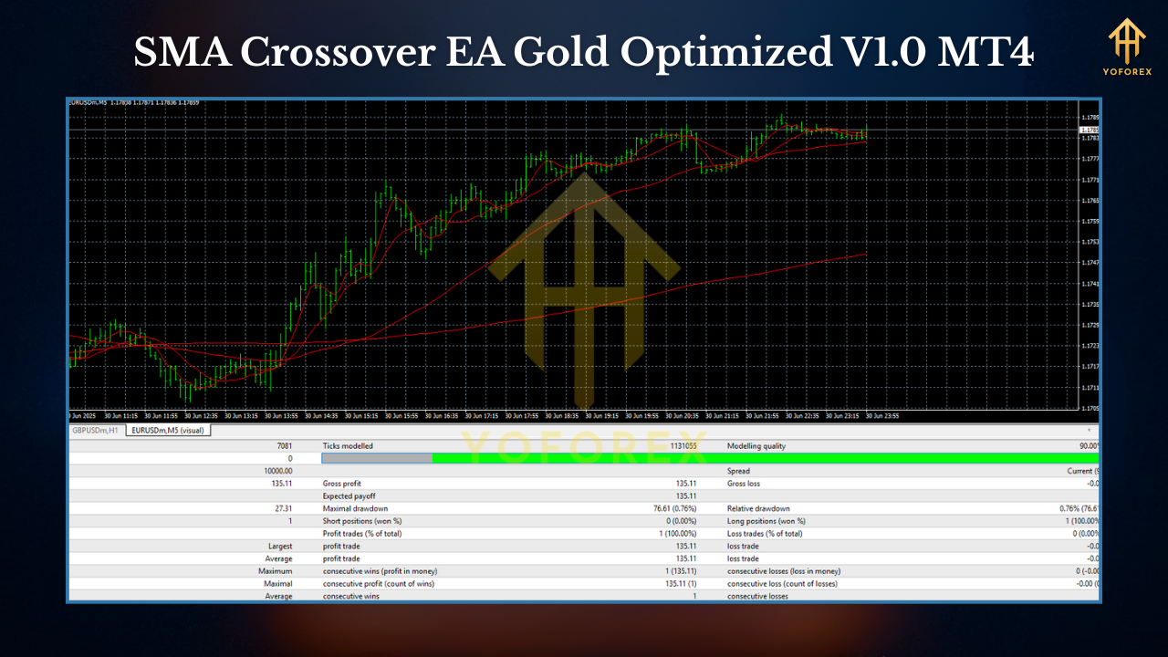 The SMA Crossover EA Gold Optimized V1.0 MT4 is built for traders who want a straightforward automated strategy tuned for one of the most popular instruments—XAUUSD. Gold has unique volatility and price action, and this EA’s filters were adjusted to reduce false breakouts while still catching large directional moves.