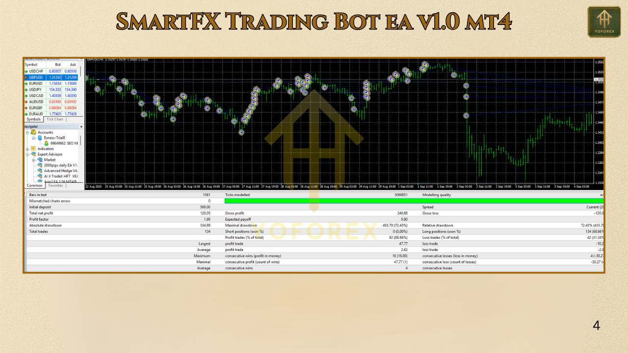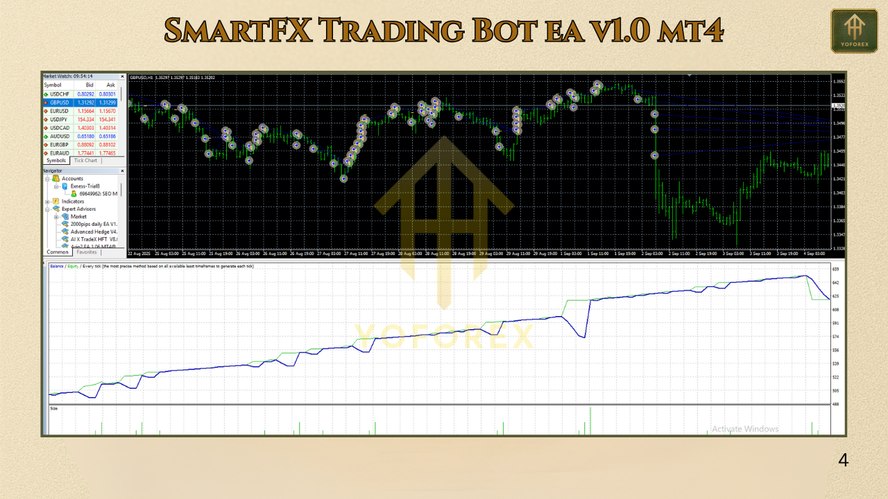 The SmartFX Trading Bot EA V1.0 MT4 is a plug-and-play Expert Advisor that automates trade entries, risk control, and exits across major currency pairs and gold. It’s a balanced system built for real-world trading, combining classic trend detection with volatility awareness and adaptive trade management.