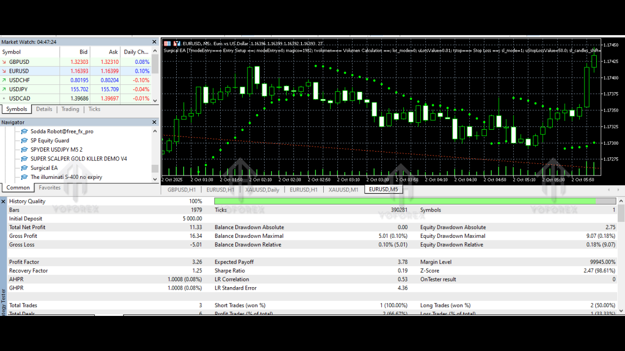 Backtesting and performance evaluation show a lot about an EA’s true identity. Surgical EA V2.0 MT5 demonstrates what I’d call calculated confidence. It doesn’t rush into setups. It waits… and when it executes, the trades usually run smoothly.
